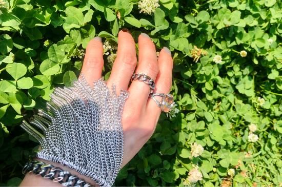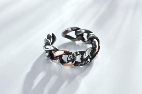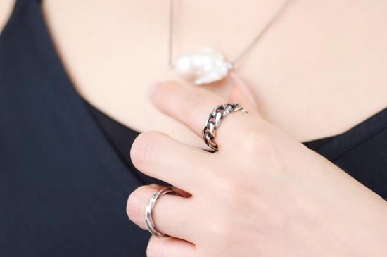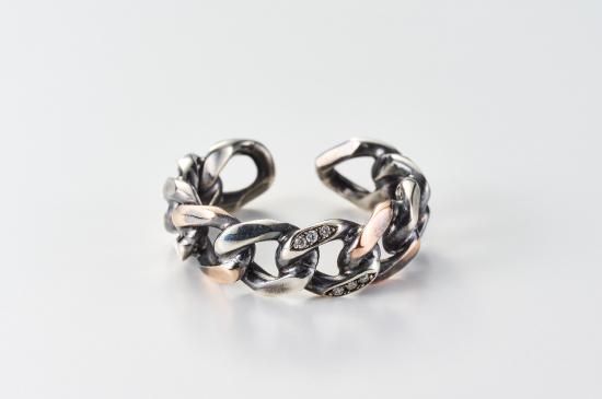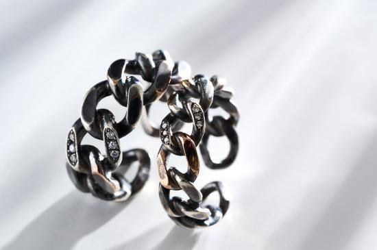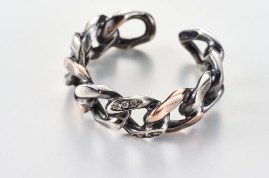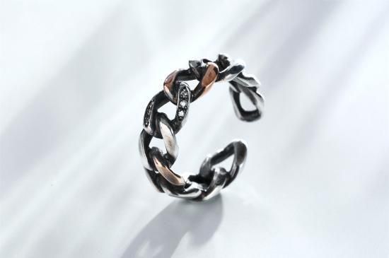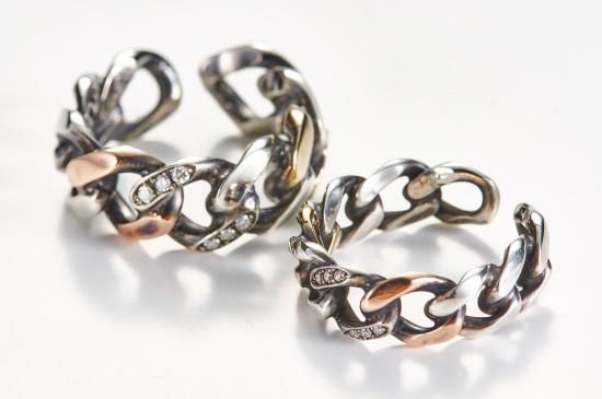職人が、リ・デザインされた喜平チェーンの駒を1つ1つ丁寧に仕上げ、溶接し組み上げた後に曲げ加工をおこない成形しています。雰囲気もアンティーク加工をあえて施すことで、上品な仕立てになっています。